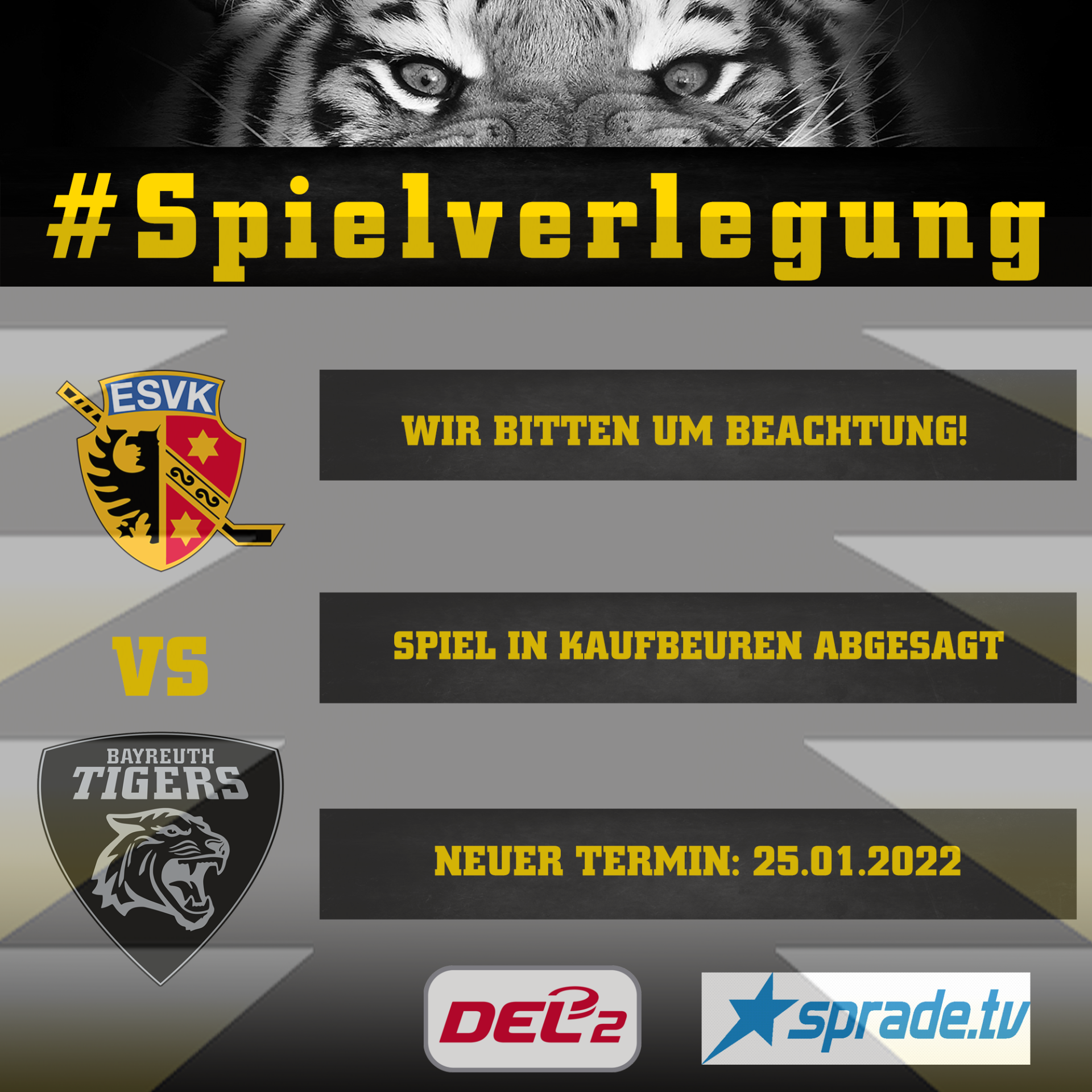 Aufgrund von aktuell vier bestehenden Quarantäne-Maßnahmen für Spieler der Bayreuth Tigers, einer extrem angespannten Personalsituation beim DEL-Kooperationspartner Nürnberg Ice Tigers und zusätzlichen Verletzungen im Team des Zweitligisten machen ein ordnungsgemäßes Antreten der Tigers unmöglich. In Absprache mit dem Club aus Kaufbeuren einigten sich die Bayreuther darauf, dieses Spiel zu verlegen. Die Partie wurde auf Dienstag, 25. Januar 2022 neu terminiert. Spielbeginn ist 19:30 Uhr.